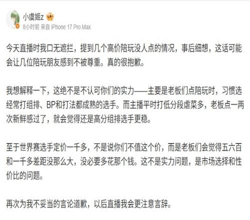 今天直播时我口无遮拦,提到几个高价陪玩没人点的情况,事后细想,这话可能会让几位陪玩朋友感到不被尊重。真的很抱歉。