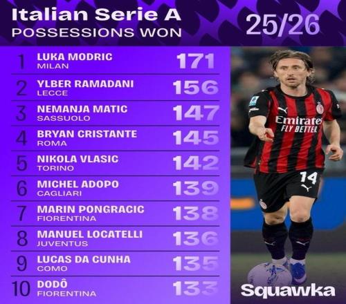 北京时间4月3日,知名数据平台Squawka更新本赛季意甲夺回球权次数排行榜,40岁老将莫德里奇171次位列第一。